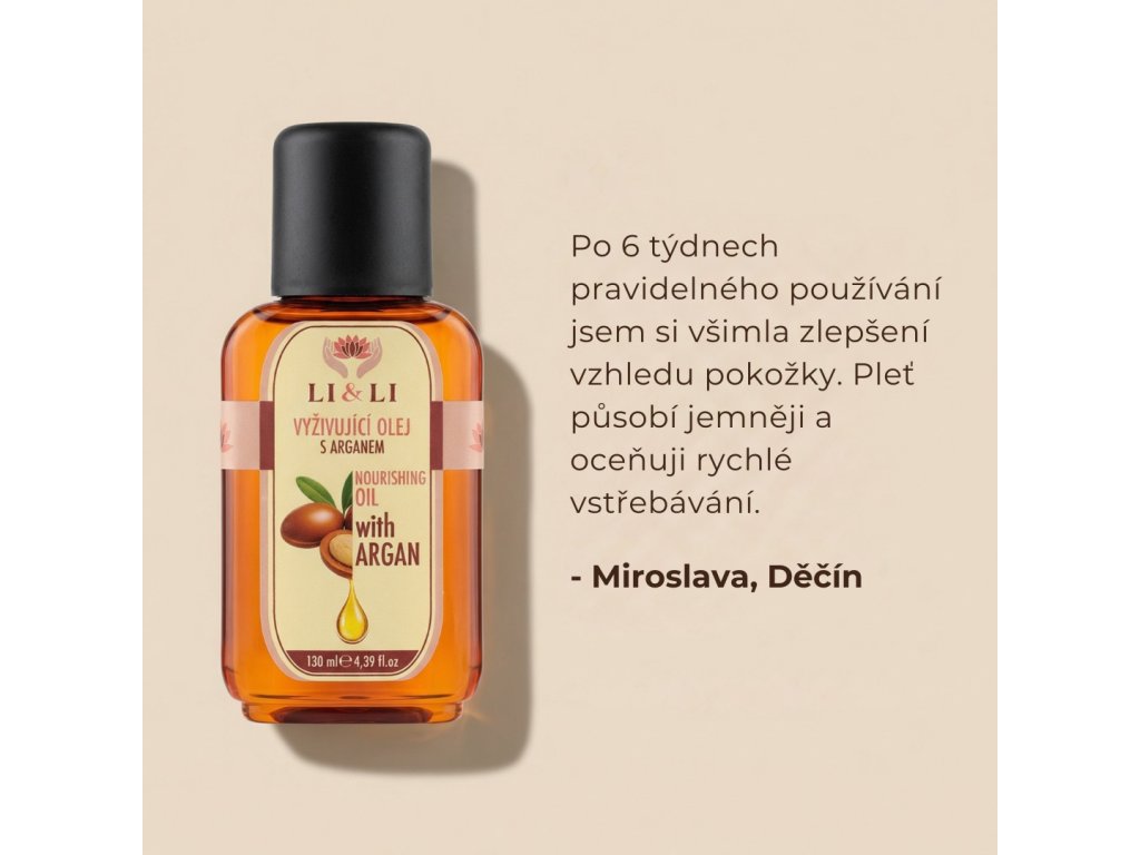 „Dobrý den! Vloni při návštěvě Li&Li Akupresura mi byl doporučen vyživující olej s arganem, který jsem si zakoupila. Vyživující olej pomáhá na suchou pokožku, také aplikuji na obličej ráno. Investovat na vyživující olej nebyla chyba.“